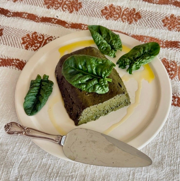 And when I want my spinach to take center stage, as the stuff available right now surely deserves, I make my version of Spinach Sformato, the Italian cousin of Spinach Souffle, only without either the bechamel or the stress of the thing rising or, too often, not ;-). My sformato is rich and dense and moist like a firm savory pudding, deep dark green throughout. It contains eggs, olive oil and two different cheeses, one tangy fresh and soft, the other lightly aged, buttery and deeply flavorful. It feels cleaner and more “modern”, if you will, than souffle.