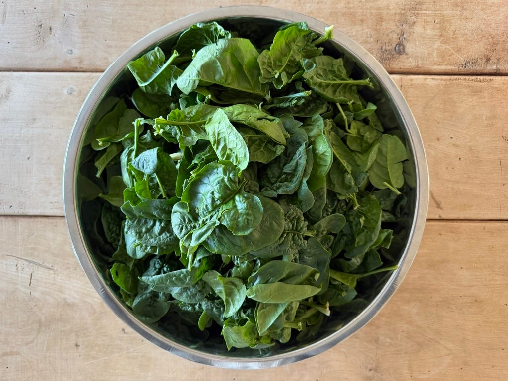 Our locally-grown spinach seems better than ever this season, big stocky dark-green leaves of varieties like Bloomsdale and Olympia,